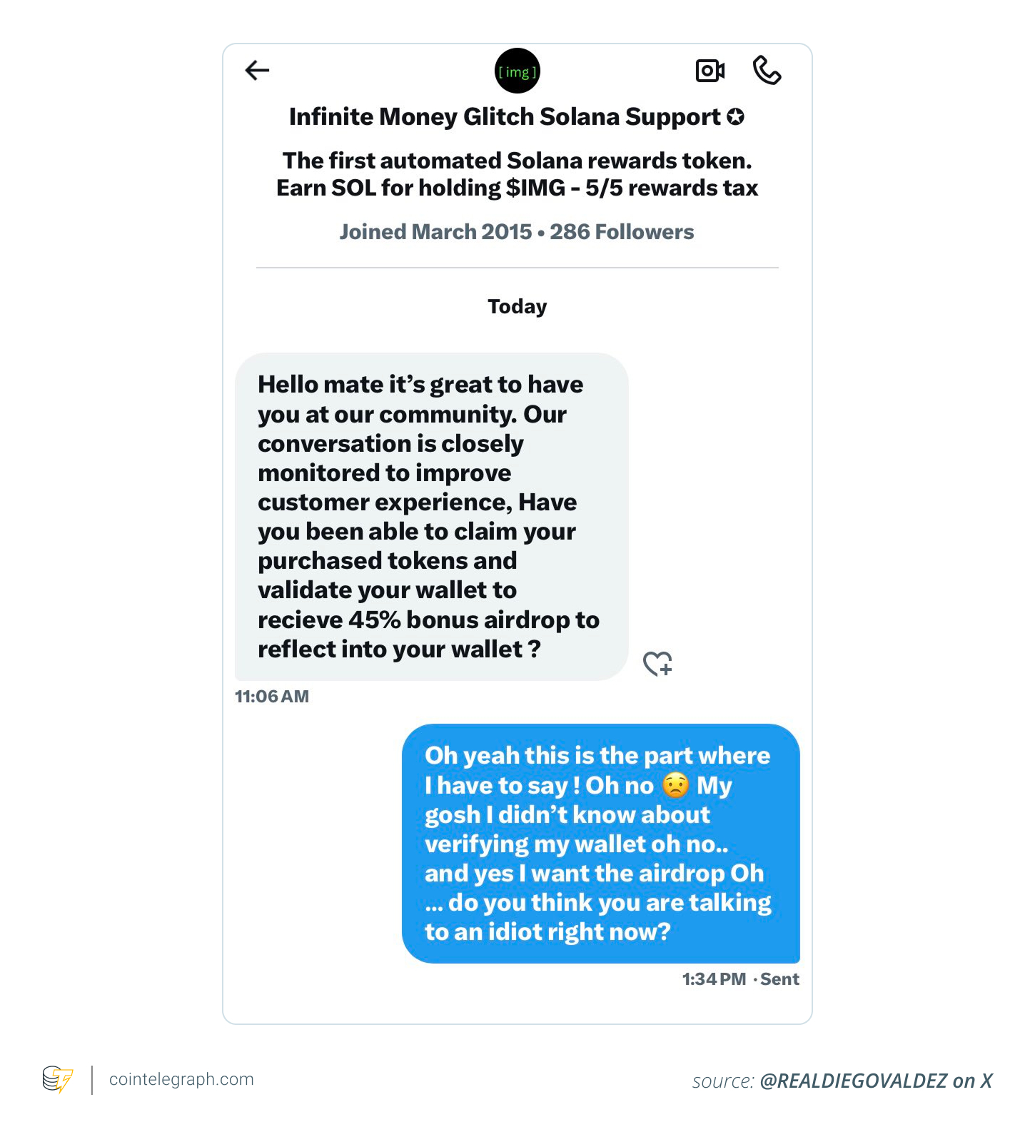 What to watch for: A major warning sign of a fake airdrop is the lack of any announcement on the project’s official communication channels. Scammers often use unsolicited direct messages, unofficial Telegram groups or poorly crafted websites mimicking legitimate ones to promote fake airdrops.