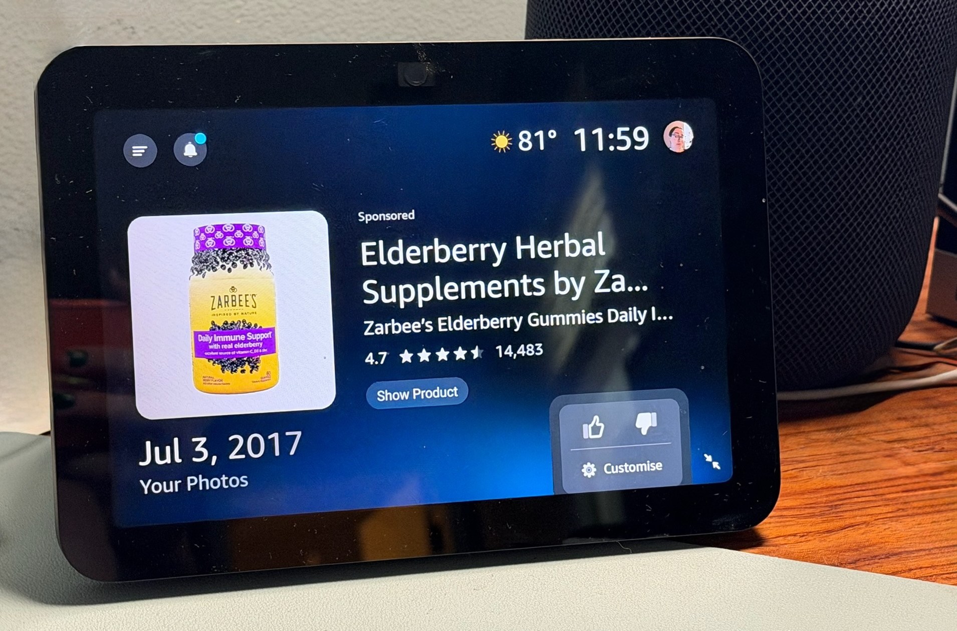 As I type, the last-gen Echo Show 8 on my desk showed an ad for an herbal supplement between a snapshot of my daughter dancing at her aunt’s wedding and a baby picture of my son. The ad reappeared two photos later, and then again. And again.