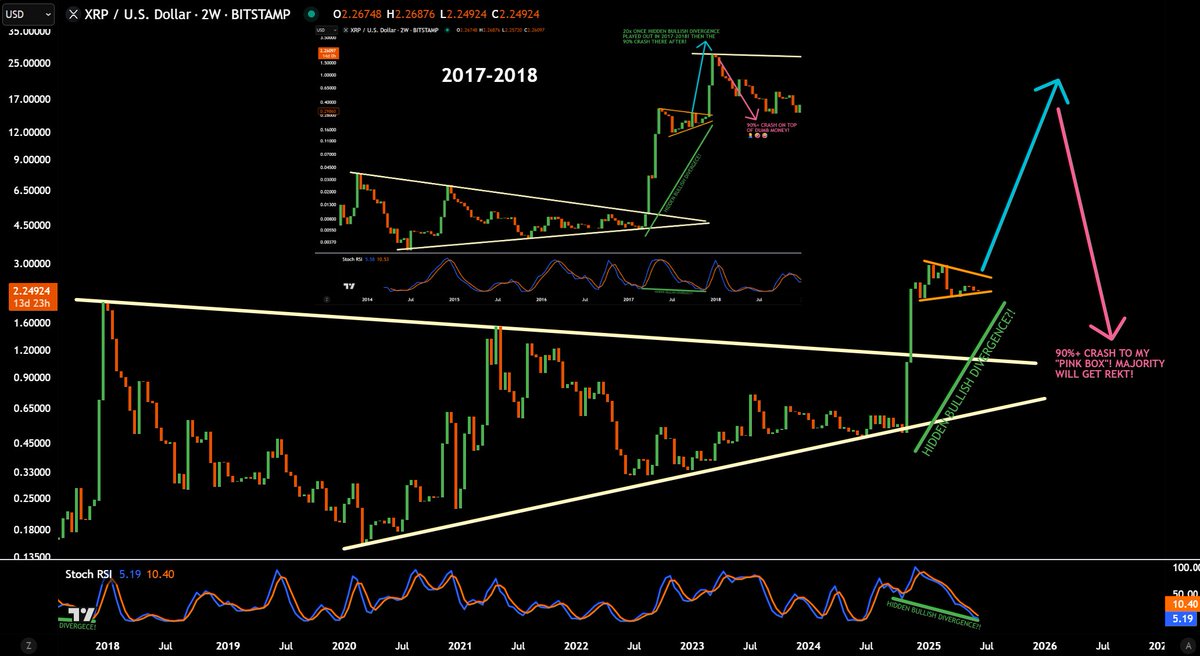 Fellow analyst Jaydee_757 echoed this, saying that XRP’s current technical setup is “comparing the 2017 hidden bullish divergence” in the weekly time frame.