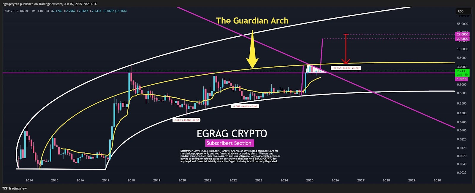Using his “The Guardian Arch” analysis, the analyst suggested that XRP’s price may rally to $20, potentially topping out at $27 based on past price patterns and timelines.