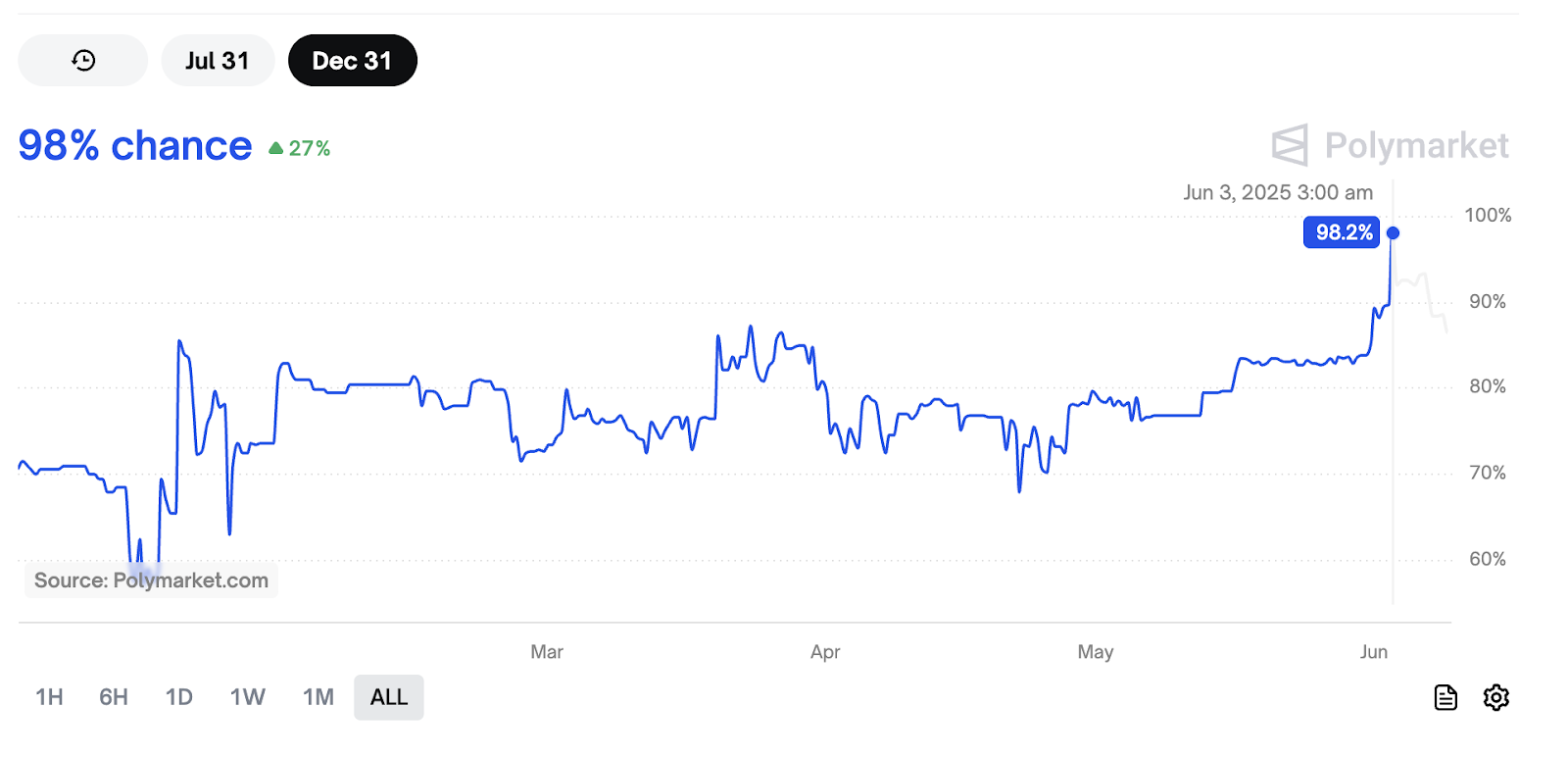 Despite SEC delays on the filings, the CME futures market’s success and corporate strategies have driven Polymarket’s approval odds from 68% in April to as high as 98% in early June, reflecting expectations for approvals by Dec. 31.