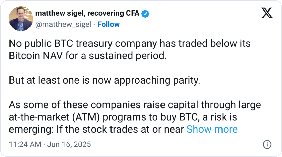 “As some of these companies raise capital through large at-the-market (ATM) programs to buy BTC, a risk is emerging: If the stock trades at or near NAV [net asset value], continued equity issuance can dilute rather than create value,” VanEck’s head of digital assets research, Matthew Sigel, said in an X post on Monday.
