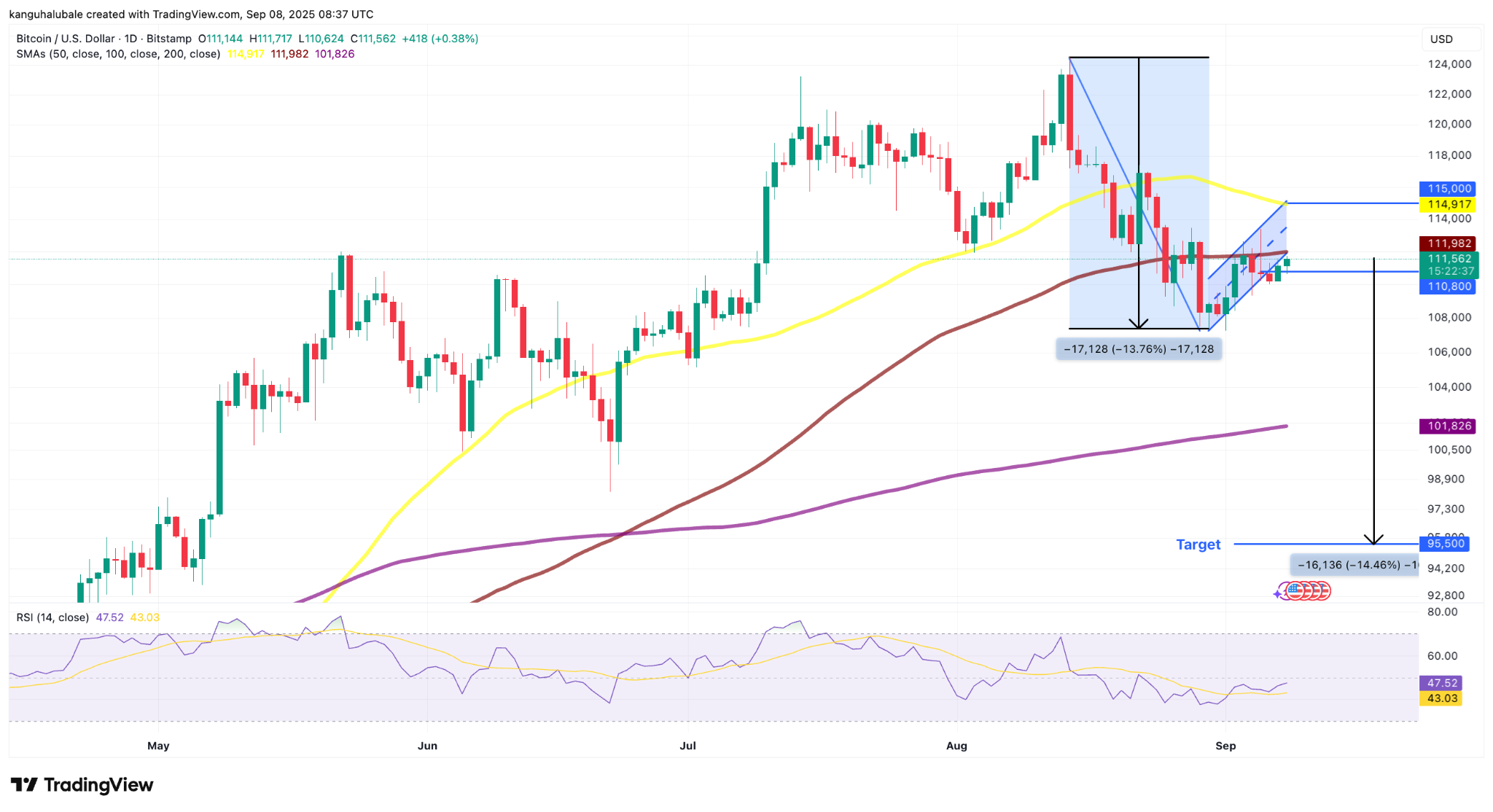 Failure to flip $112,000 into support would trigger the continuation of the downtrend toward the measured target of the bear flat at $95,500, or a 14.5% drop from the current price.
