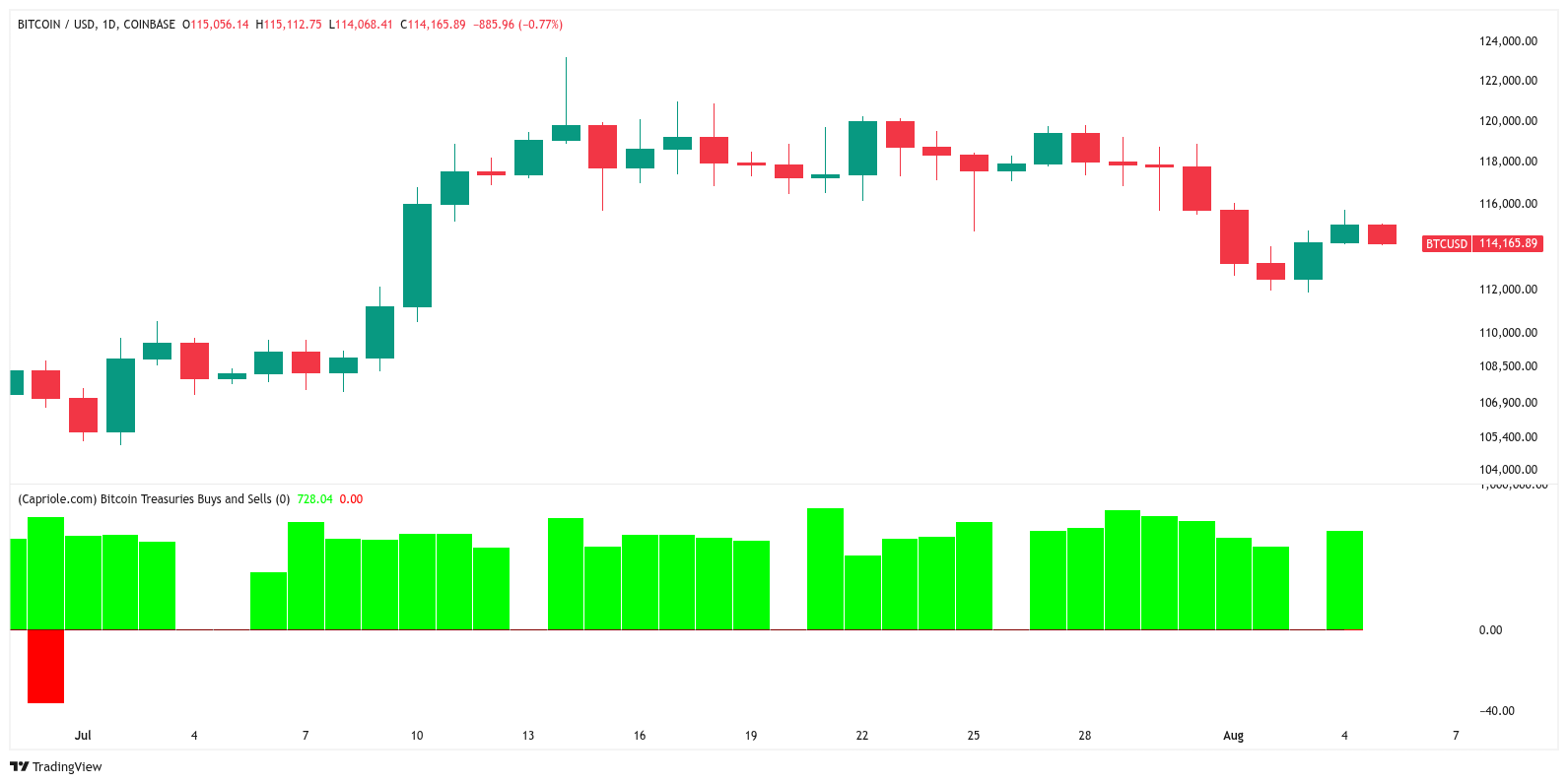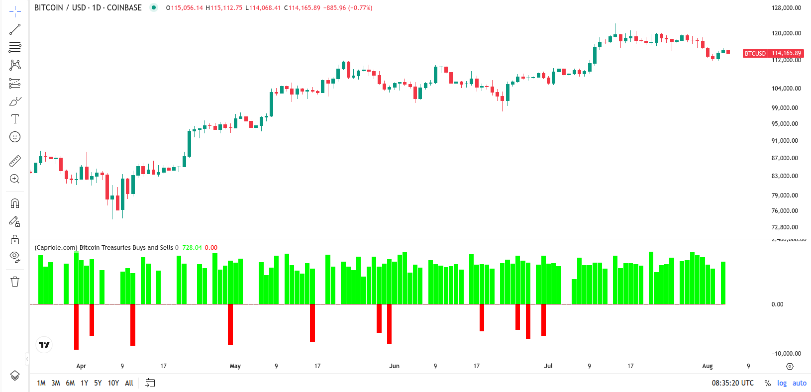 Capriole reveals corporate treasury interest stayed strong throughout July, meanwhile, with the biggest day, July 21, seeing buys of over 26,700 BTC ($3 billion).
