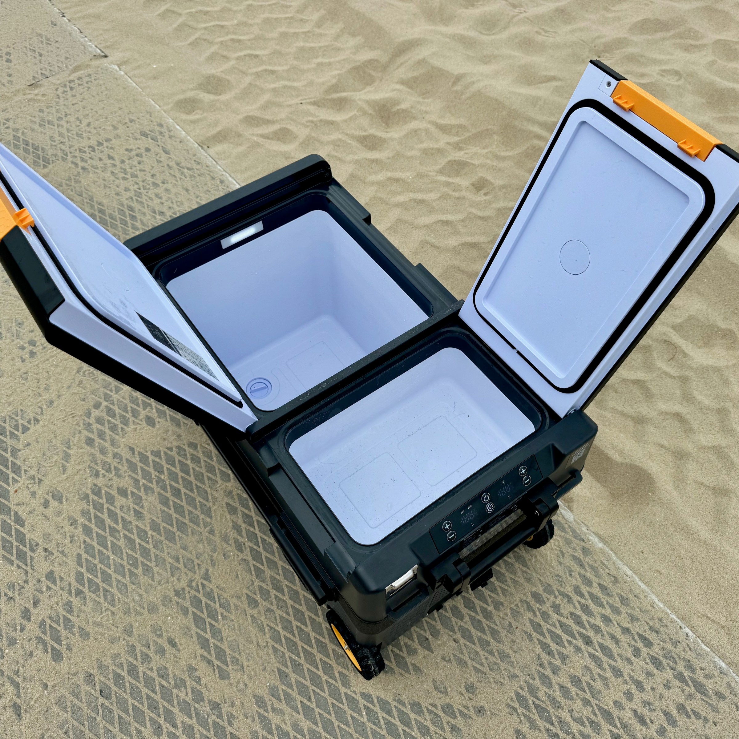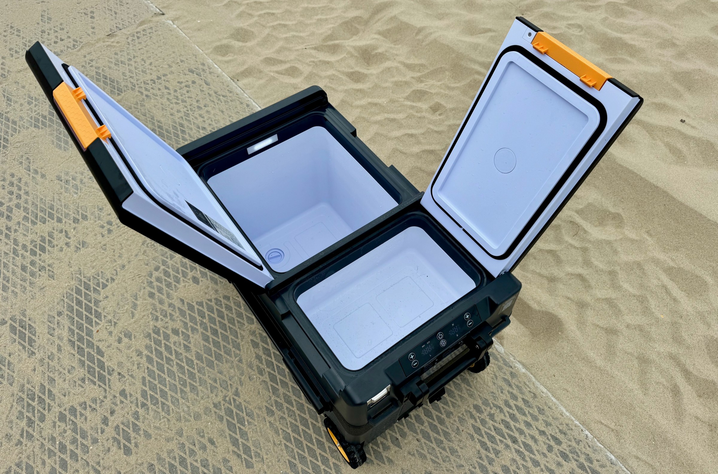 Importantly, the two cooling compartments — one large (32.5 liters) and one small (7.2 liters) — are covered by a pair of doors that can be reversed for easy opening from either side. This adaptability is fantastic for vanlifers or anyone else with limited space for such a large appliance.