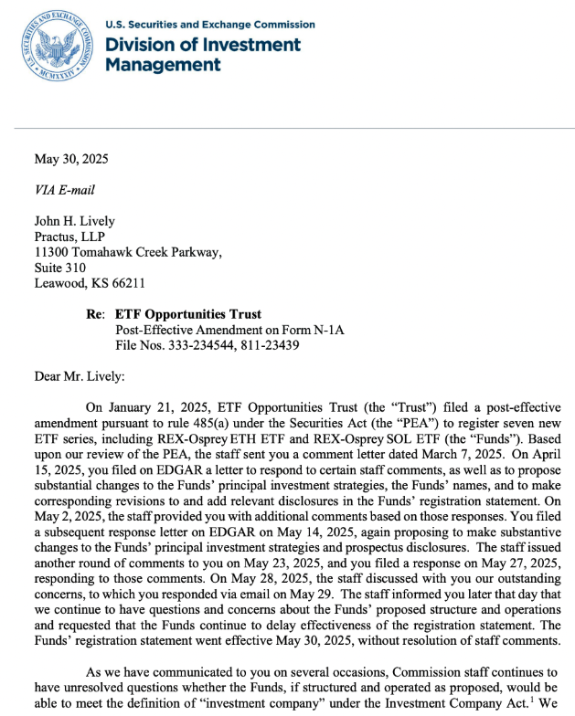 SEC’s letter on staking ETF filings raises concern over the structure of the ETFs. Source: SEC