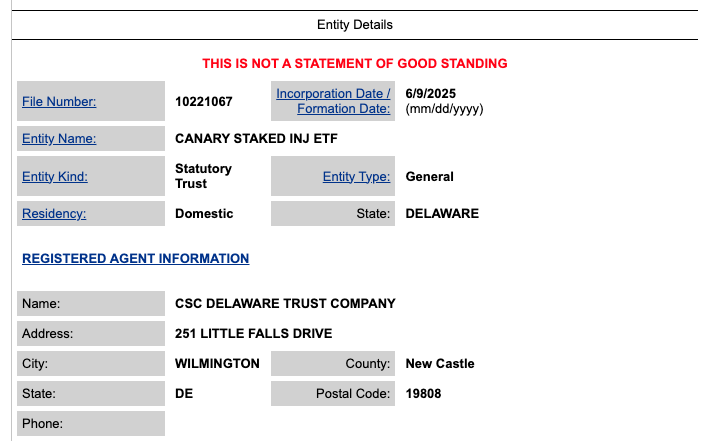 A regulatory entry showing Canary Capital’s staked INJ ETF trust. Source: Delaware Division of Corporations