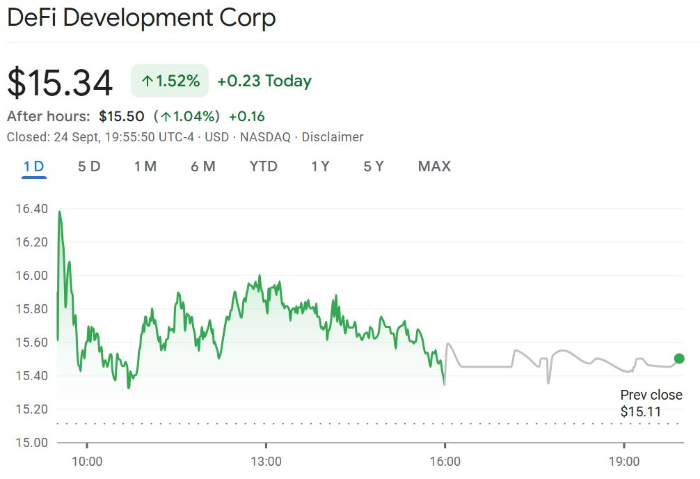 At the same time, Solana treasury company DeFi Development Corp (DFDV) expanded its share repurchase from $1 million to $100 million, which saw its stock register gains of over 5%, before settling at a more than 2% gain and another 1% after hours to trade at $15.50.