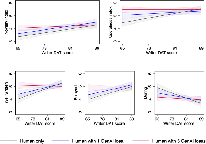 But what about the people who scored highly on the creativity metric? Did their writing climb to new heights? Sadly, no. In fact, those participants saw little to no benefit at all, or even (though it’s very close and arguably not significant) worse ratings. It seems that those on the creative side produced their best work when they had no AI help at all.