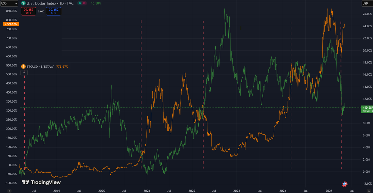 In the 2023-2026 cycle, BTC caught up with the DXY in early 2024, and the two moved largely in sync until recently. A clear divergence began at the beginning of April 2025, with the DXY dropping below 100 for the first time in two years.