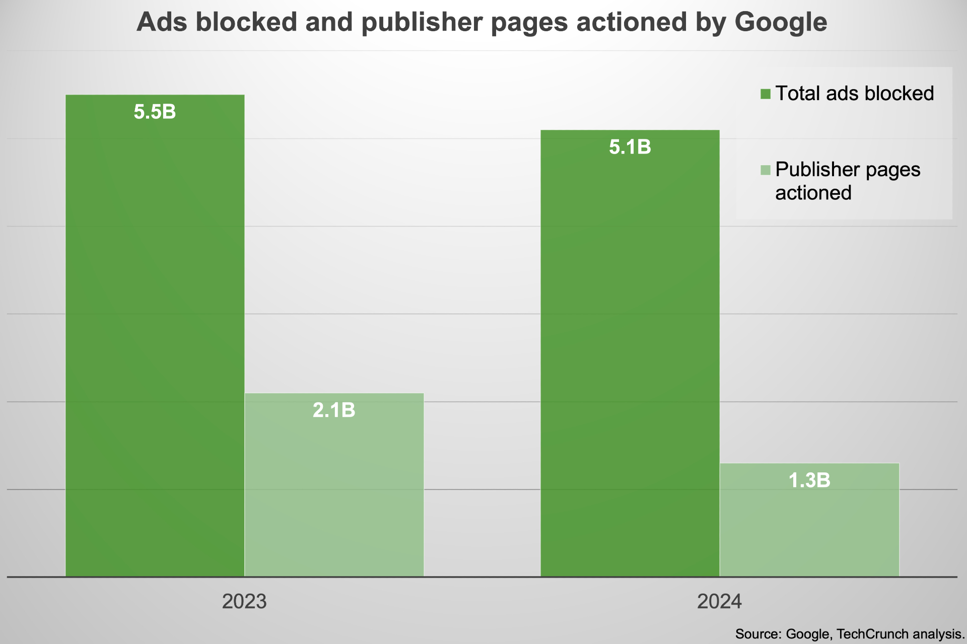 In total, Google said it blocked 5.1 billion ads last year and removed 1.3 billion pages. In comparison, it blocked over 5.5 billion ads and took action against 2.1 billion publisher pages in 2023.