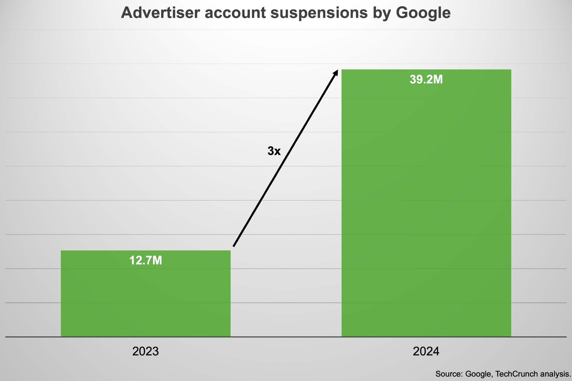 Google on Wednesday said it suspended 39.2 million advertiser accounts on its platform in 2024 — more than triple the number from the previous year — in its latest crackdown on ad fraud.