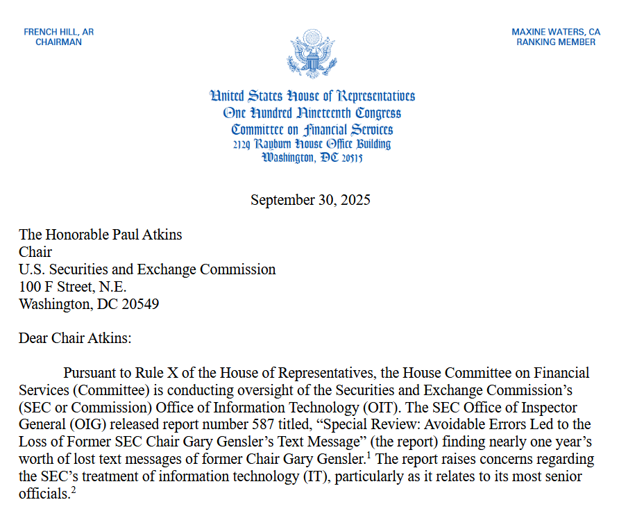 The SEC’s Office of Inspector General’s findings in early September cast doubt on whether the Gensler-led SEC acted with transparency and integrity while serving between 2021 and 2025, House Financial Services Committee Chairman French Hill said in a letter to Atkins on Tuesday.