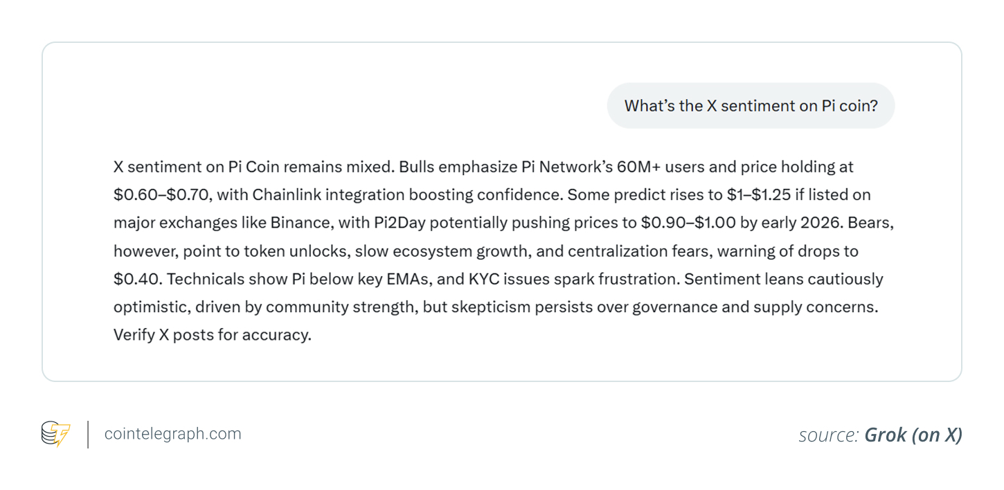 Grok reports mixed X sentiment on Pi Coin: bulls see $1–$1.25 potential with strong community and Chainlink boost, while bears warn of $0.40 drop due to unlocks, centralization, and KYC issues.