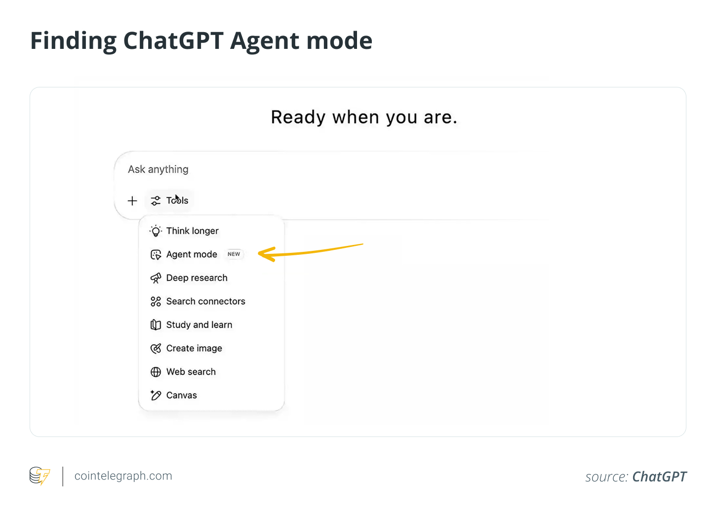 Begin by opening any ChatGPT conversation. From there, click the Tools → Agent Mode dropdown, or simply type /agent to activate the workspace. This launches a virtual desktop with browser tabs, terminal access, spreadsheet tools and API connectors, all designed for executing multi-step crypto workflows.
