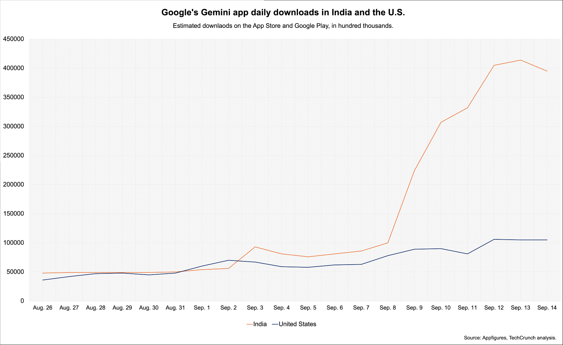 Daily downloads of the Gemini app in India significantly surged following the release of the Nano Banana update, beginning on September 1 with 55,000 installs across both app stores. Downloads peaked at 414,000 on September 13 — a 667% increase — with Gemini holding the top overall spot on the iOS App Store since September 10 and on Google Play since September 12, including across all categories, Appfigures data shows.