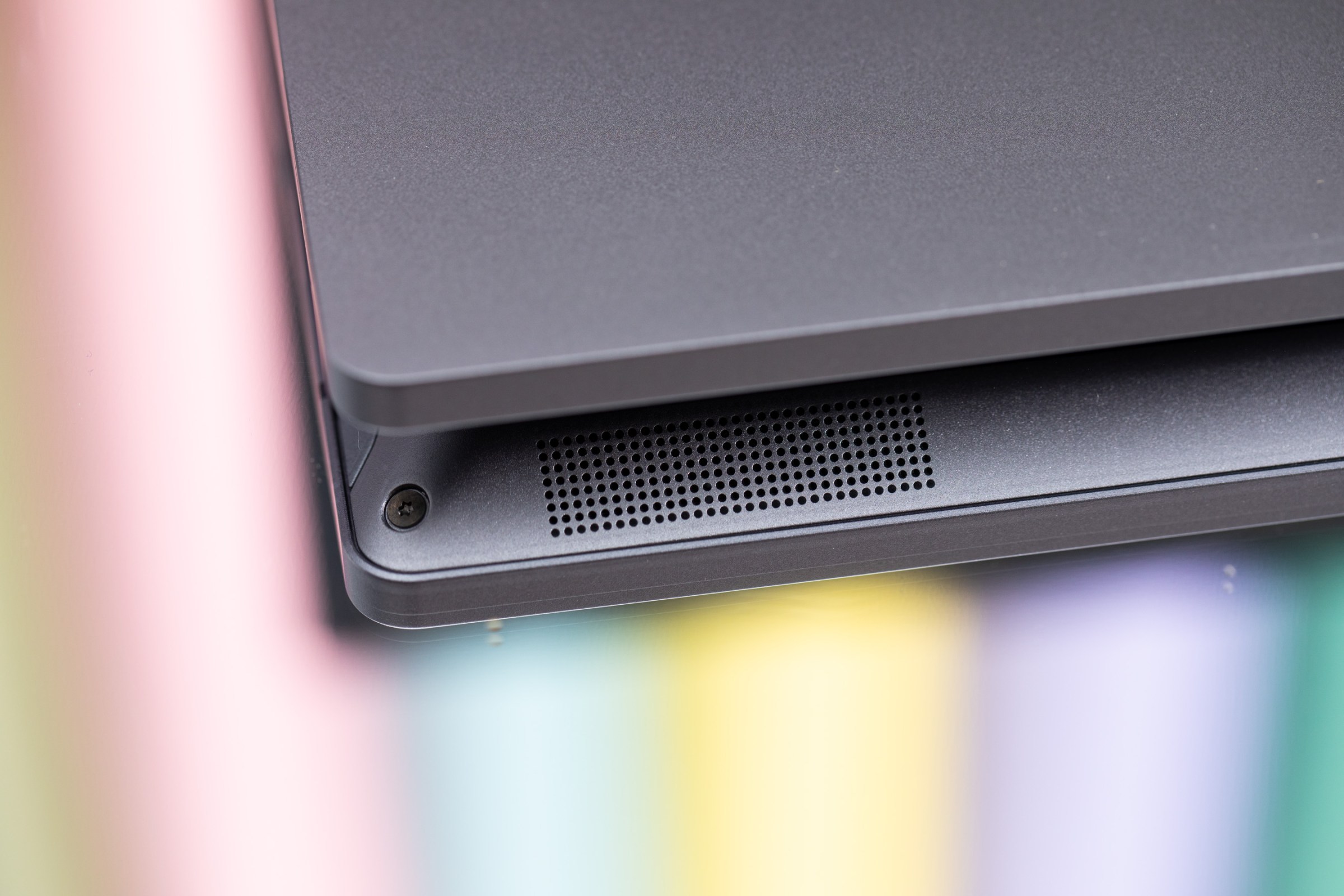 Because part of the screen is garaged under the keyboard deck, there’s no space next to the keyboard for the speakers, so instead they’re at the front of the chassis, angled down. They’re mediocre for a $3,300 laptop, and the sound is often obscured by your wrists.
