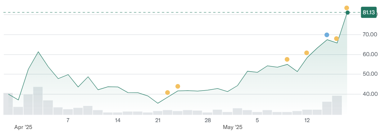Shares of AI cloud computing company CoreWeave (CRWV) surged on May 16 after chip giant Nvidia revealed a large ownership stake, signaling growing corporate and institutional interest in the newly public company.