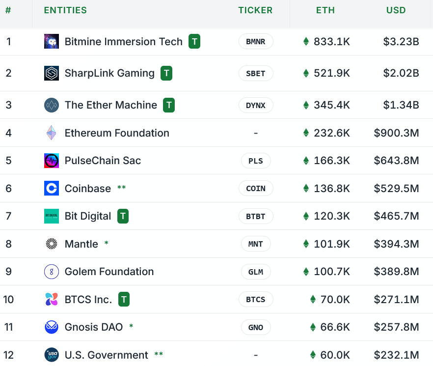 SharpLink and The Ether Machine hold $2 billion and $1.34 billion worth of ETH, respectively, while the Ethereum Foundation and PulseChain round out the top five.