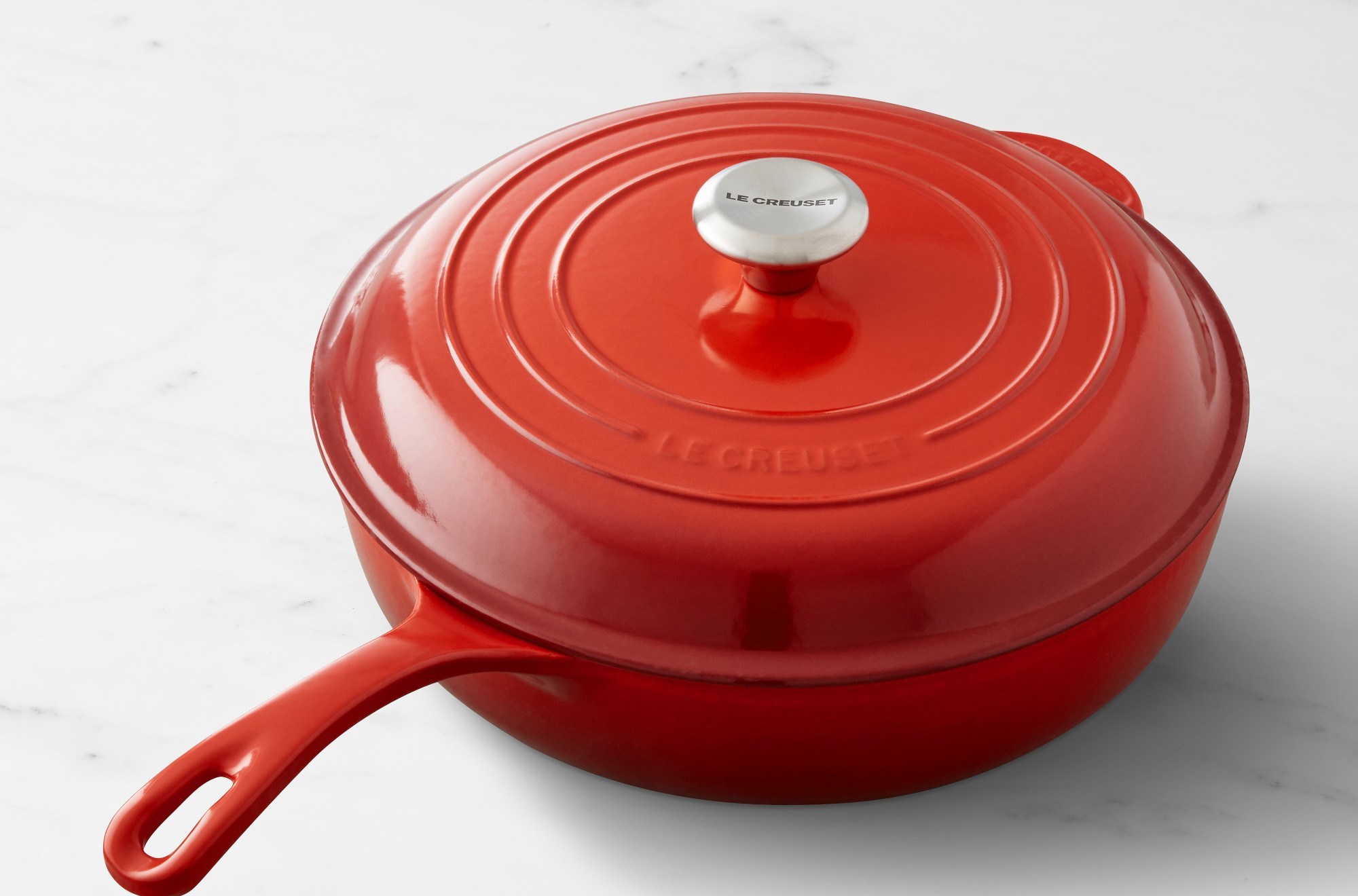 Its official name is Le Creuset Signature Enameled Cast Iron Deep Saute Pan, 4 1/4-Qt., and you can only get it at Williams Sonoma, which I discovered when I tried to buy one as a wedding gift for my brother-in-law. I did buy it for them, and I also got one for my sister-in-law as her wedding gift a few years later! Thankfully, I am now out of in-laws to buy them for. They’re not cheap.