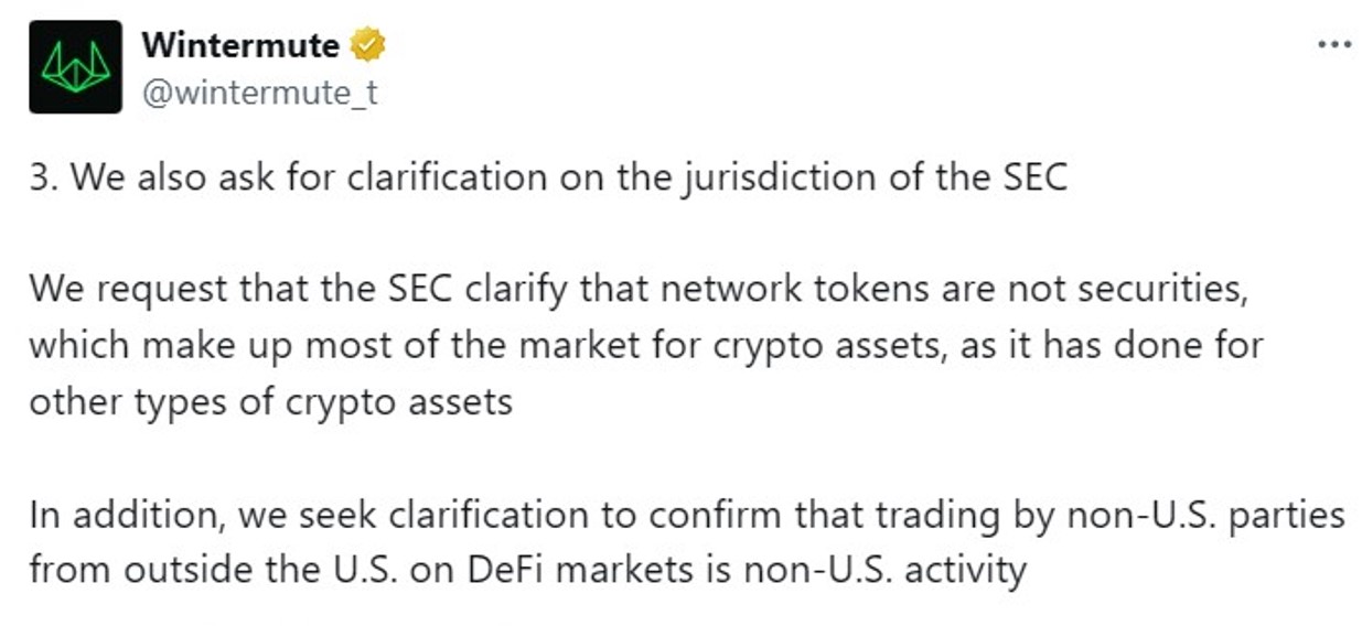 Trading company and market maker Wintermute asked the United States Securities and Exchange Commission (SEC) to confirm that network tokens should not be classified as securities.